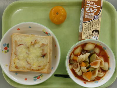 7月3日(木)のメニュー:コーヒー牛乳、クロックムッシュ、ズッキーニのトマトスープ、冷凍みかん