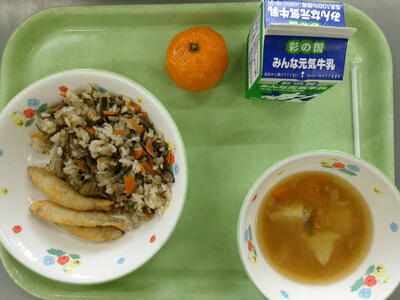 10月15日(水)のメニュー:牛乳、わかめ菜めし、イカのかりん揚げ、かきたま汁、みかん