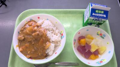 9月3日(水)のメニュー:牛乳、カレーライス(麦ごはん)、フルーツ杏仁
