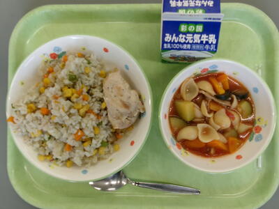 9月8日(月)のメニュー:牛乳、コーンピラフ、ガーリックチキン、ズッキーニのトマトスープ