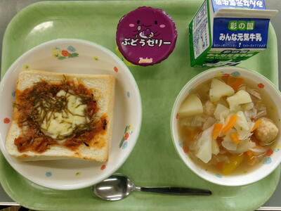 9月10日(水)のメニュー:牛乳、のりピザトースト、彩り野菜スープ、ぶどうゼリー