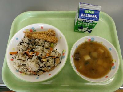 5月27日(火)のメニュー:牛乳、ごはん、ひじきのり、チキンチキンごぼう、相性汁