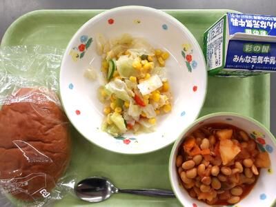 今日の給食のメニューのポークビーンズはアメリカの家庭料理です。豚肉と豆をトマトで煮込んだもので、たんぱく質が多く栄養的にも優れているそうです。本場アメリカでは白いんげん豆を使うことが多いですが、給食では大豆を使いました。気温も少し下がってきましたが、日中はまだまだ暑い日が続きます。たくさん食べて体力をつけましょう。