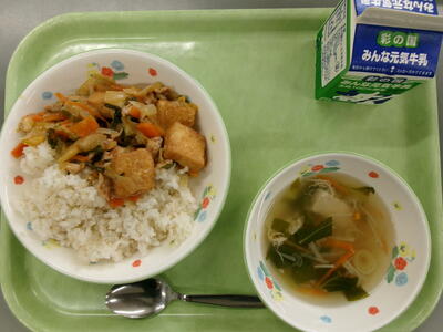 10月2日(木)のメニュー:牛乳、厚揚げのピリ辛丼、春雨スープ