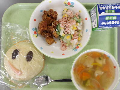 「市民の日」は、鴻巣市、吹上町、川里町が合併した10月1日を記念し制定された日です。この日を記念した献立で、毎年鴻巣ならではの楽しめるメニューとなっています。今日は、マカロニをコスモスに見立てたコスモスサラダ、ふわふわのメロンパンに、ひなちゃんのお顔がついた、鴻巣ひなちゃんパンなどが登場しました。みんなで楽しくいただきました。