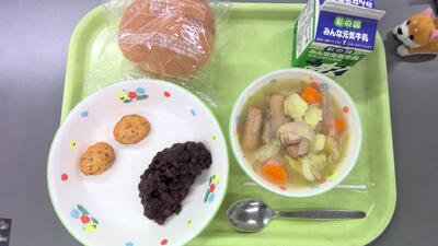 今日は、給食室で朝から調理員さんがコトコトあずきを炊いて出来上がったあんこを、自分でパンにはさんで食べる、セルフあんパンでした。やわらかなパンとよく合いました。じゃがいもやウィンナーなどがたっぷり入ったポトフと一緒に美味しくいただきました。