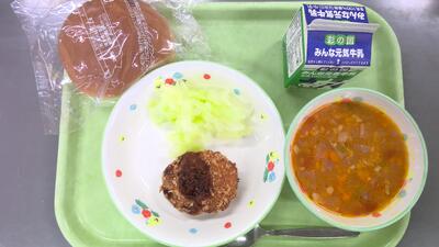 10月22日(水)のメニュー:牛乳、こどもパンスライス、こうのすコロッケ、ボイルキャベツ、ミネステ麦麦リゾット