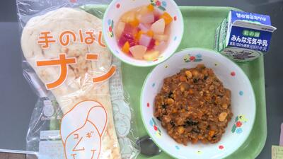 10月27日(月)のメニュー:牛乳、ナン、キーマカレー、フルーツミックス