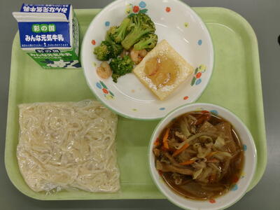 今日のワンタンスープに使われているワンタンは、小麦に中華めんなどにしようするかん水を加えてこねて作った薄皮に、ひき肉や細かく刻んだ野菜を包んだものです。ワンタンは皮の食感やのど越しも楽しむ食べ物だと給食委員会の児童が放送をしてくれました。たっぷりのワンタンが入ったスープを美味しくいただきました。