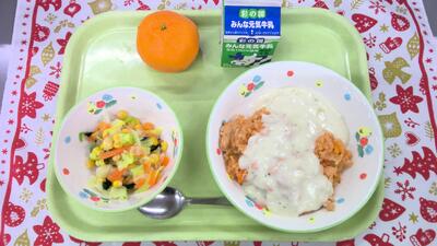 11月27日(木)のメニュー:牛乳、チキンライスのホワイトソースかけ、ほうれん草サラダ、みかん